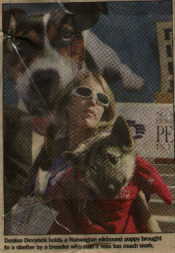 Devynck holds a Norwegian Elkhound puppy, (one of two she rescued from the