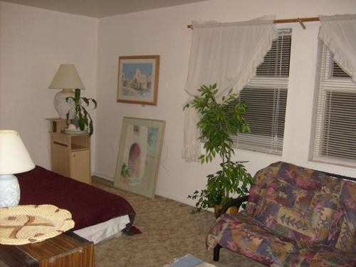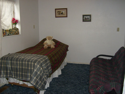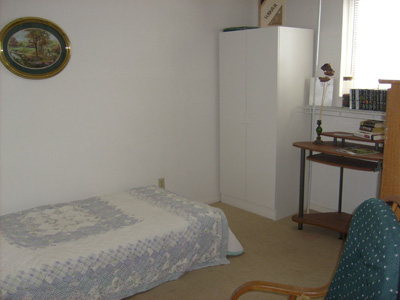North Facing Bedroom with twin , dresser, cherry wood tables, TV, Cable, wireless internet, work out bench, row machine avail.