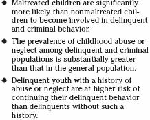 Children’s exposure to violence and child maltreatment is highly correlated with depression, anxiety, posttraumatic stress, anger, substance abuse, and poor school performance (Garbarino et al; Martinez and Richters; Singer et al; and Ciccetti and Carlson, as cited in Marans and Berkman, 1997). These symptoms are clear indicators, however, the Surgeon Generals’ report states that abuse and neglect are "relatively weak predictors of violence," and "most children who are abused and neglected will not become violent offenders during adolescence." Conversly, the role of family and parental factors, influenced by social learning, modeling, and identification with the aggressor, with respect to aggressive, physically abusing, and criminal parents is well cited in the literature as predictive of aggressive/antisocial behavior (Fry 1988; Hall and Cairns 1984; West and Farrington 1977; as cited in Shaw & Campo-Bowen, 1995).