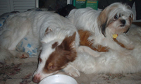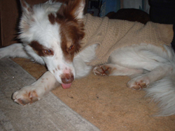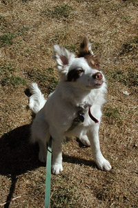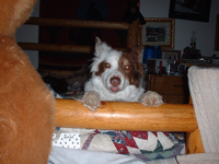 *PAINT Purebred Red Border Collie was born deaf, and his loving Breeder was afraid he would be in danger if adopted out and was going to put him to sleep. But his daughter called Denise to see if she could find him a safe home. Thanks Victoria for having a loving heart and open mind to look into the possibility of making him a therapy dog since Intermountain Therapy Association will allow it, so we need to find an adult home that needs the most loving companion and will train him extensively to hopefully be an inspiration to deaf children. He can really help a lot of deaf kids. He is very loving, smart and cuddly. He is the most calm Border Collie we have ever seen. He has been learning some hand signals already. We are looking for a foster home for him as of 10-01-02. 12-10-02 He will be starting one on one hand signal training with our volunteer Rebecca at the Service Dog/Therapy Dog School soon. Thank you Cassie and Bonnie for fostering and training him in our Kids Club program. He will start hand signal training this week with David Lyman and our volunteer Rebecca who wants to work with therapy dogs. Congratulations Cassie on not only training him to pay attention, sit, down, follow, but now to walk around behind you to your left side and sit at attention, walk up to the agility bar, sit and jump on your command. He learns so quickly and loves everyone. Thanks Cassie for wanting to continue to help Paint. Did you see their great pictures in The Park Record?