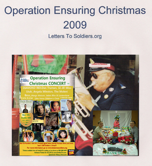 A: Well Letterstosoldiers.org is now in its third annual Operation Ensuring Christmas Campaign. Last year we were able to send 1,543 care packages to six units, including a hospital in Kuwait, that we have been sending to now for our second year. And it’s thanks to amazing companies here in Utah like: UPS, Tahitian Noni, Neways, Richard Paul Evans, Cricket Communications and on and on and on that we have been able to raise last year, fifteen thousand dollars for the shipping costs. And with the help of so many volunteers here in Utah: from the companies, individuals, the Veterans of Foreign Wars, Disabled Veterans and their auxiliary wives, we were able to send so many special Utah products and handmade things like Christmas stockings. Christmas cards from forty school districts across Utah, and this year we hope to be able to send 2,500 which is our goal.