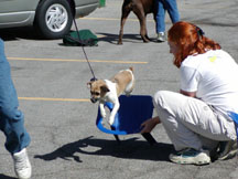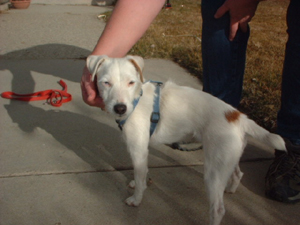 BRIGITTE 3 yr. small with one blue eye Wirehaired Jack Russell Terrier mix little girl is adorable, smart and loving. Needs lots of training not to run and to do tricks. Only responsible adult home please, no young kids for small breed dogs or boys. Crate-trained, and starting her obedience training in our kids club. Congratulations Gina for getting her trust, respect and attention and not only teaching her to sit at attention, but fun tricks like jumping, shaking hands and begging perfectly. Amazing how quickly she is learning now. Can't wait to show off these tricks at the assemblies.