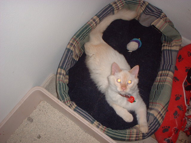 PRECIOUS is 6 months old now and the most gorgeous Flame Point longhaired Siamese boy with blue eyes. He is so fluffy. round and so loving. He loves other cats, dogs and people. He gets around just great to play as long as he is safe in the home. He needs a retired person at home to cuddle and play with. He has a permanent respiratory problem that can flare up at times since he got so sick as a 6 wk kitten when brought to the shelter. He is so trusting. He had a special surgery to remove his back leg, and found a special home that is calm, no kids, and always safe indoors in his own room of toys, loving kitty friend that cleans him, and plays with little Yorki that is so gentle. Thank you Dr. Bagley and Dr. Ampsh for saving his life!